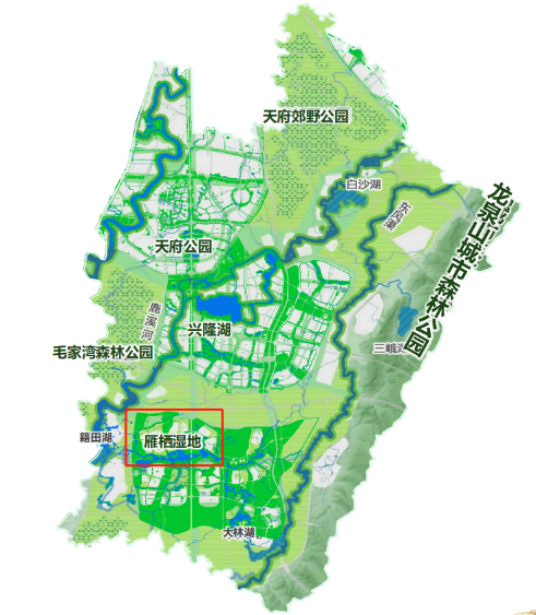 记者从中铁二院了解到,雁栖湿地位于天府新区成都直管区南部,处于落雁河流域干流下游,位于天府文创城中心位置,距离成都市第二绕高速向南约4公里。东起成自泸高速西侧,西至益州大道,天府大道从中部穿过。规划面积10000公顷,被列为2020年成都市重点项目。