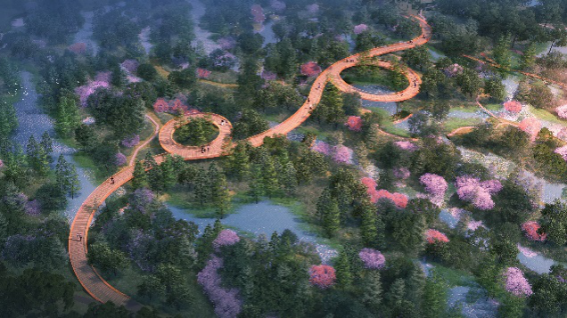 中铁二院高格公司相关负责人表示,雁栖湿地项目突出“林水一体”的特色风貌,营造西南地区规模最大的“水上森林”。项目通过提炼文化、梳理地形、生态理水、营造生境等设计手法,构建六大特色风貌区,实现山-水-林-田-草的五机结合,塑造“文、休、旅”三位一体新高地。