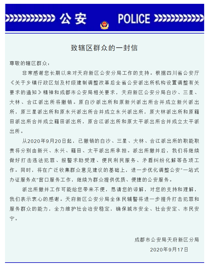 四川新闻网成都9月17日讯(记者 乔永祯 胡旭阳)9月17日,记者从成都市公安局天府新区分局了解到,根据四川省公安厅《关于乡镇行政区划及村级建制调整改革后全省公安派出所机构设置调整有关要求的通知》精神和成都市公安局相关要求,天府新区公安分局白沙、三星、大林、合江派出所将撤销。原白沙派出所和原新兴派出所合并成立新兴派出所,原三星派出所和原永兴派出所合并成立永兴派出所,原大林派出所和原籍田派出所合并成立籍田派出所,原合江派出所和原太平派出所合并成立太平派出所。