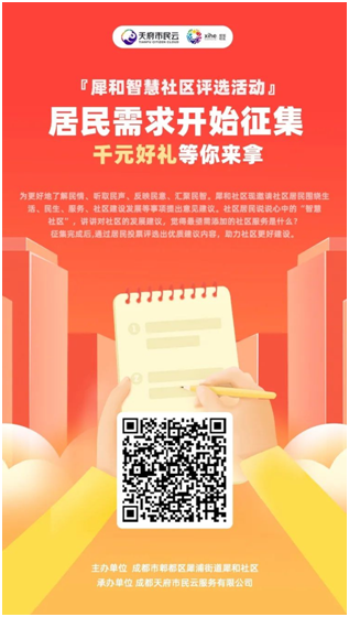 10月13日至27日期间,凡成都市郫都区犀和社区居民,可通过天府市民云围绕经济、文化、民生社区建设发展等事项提出意见建议,征集完成后将通过居民投票评选出优质建议内容,予以千元好礼奖励。
