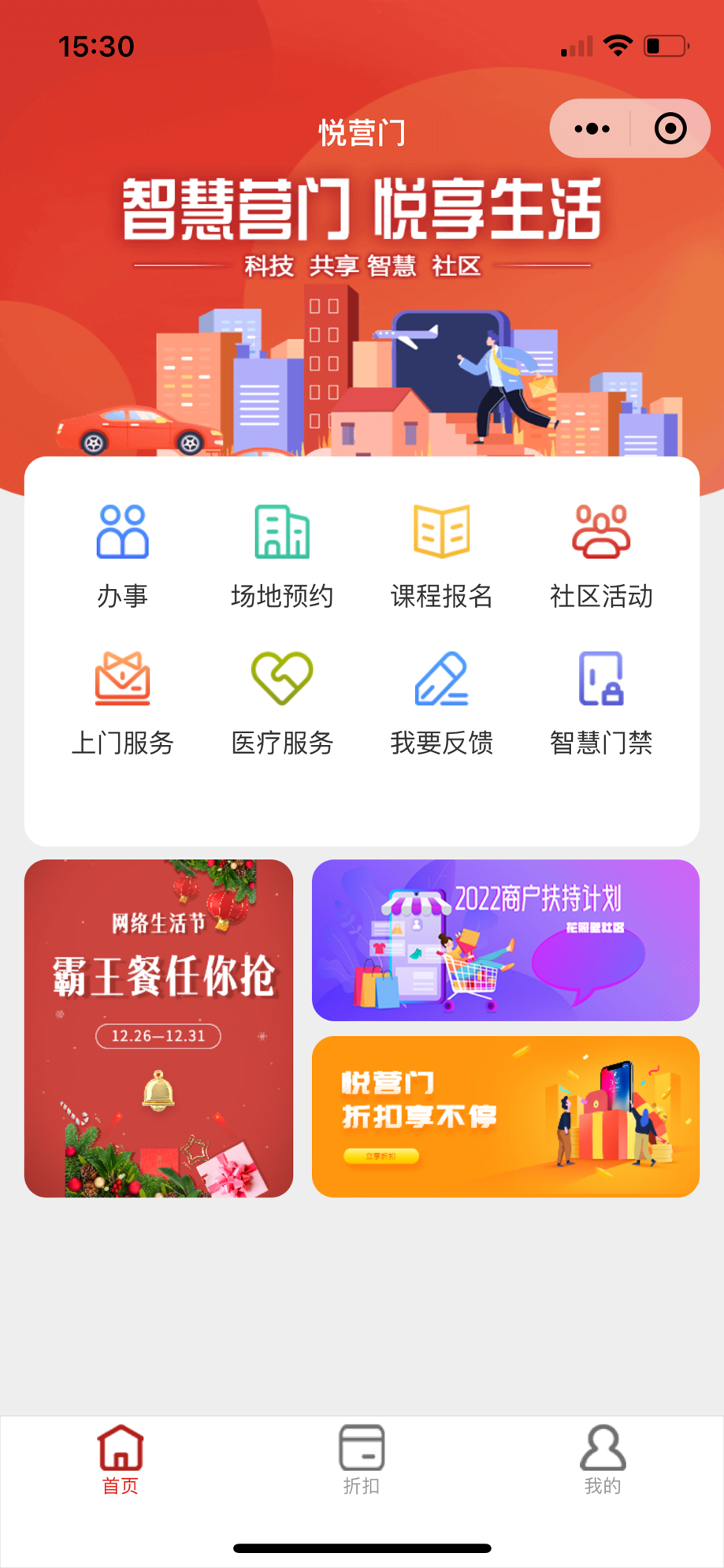 " 悦营门小程序"设有办事、预约、活动,课程报名、上门服务、医疗服务等功能让居民足不出户就可以享受到智慧社区建设带来的一系列便民服务。