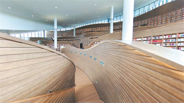 坐落于天府艺术公园内的天府人文艺术图书馆,建筑设计灵感来自杜诗“窗含西岭千秋雪”,建筑形态象征着连绵迤逦的山峰。行走于馆内,馆内高低错落的书山造型,更是彰显出“书山有路勤为径”的人文意蕴。“因为公园城市的建设,我觉得要把自然的景观移植到我们室内的阅读空间里面来。”肖平介绍说,场馆的设计跟天府文化结合得非常紧密,拥有地域特色。整个书山部分,像层峦叠嶂的群山一样,能让读者有一种在自然山水间阅读的舒适感和亲近感。这也是成都建设公园城市示范区一个很典型的范例。