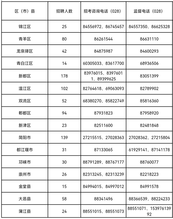 招聘单位情况及招聘人数:锦江区、青羊区、龙泉驿区、青白江区、新都区、温江区、双流区、郫都区、新津区、简阳市、都江堰市、邛崃市、崇州市、金堂县、大邑县、蒲江县16个区(市)县属教育事业单位公开招聘中小学教师933名。