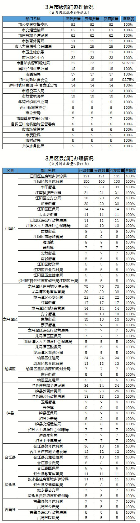 综合办结率和满意度,七个区县办结率100%,除江阳区外,其他区县满意度均为100%。参与网络问政办理的43个市级部门(单位)办结率100%,除泸州高新区管委会、泸州航空产业园区管委会、市自然资源和规划局外,其他部门(单位)满意率均达100%。(记者 段婉露)