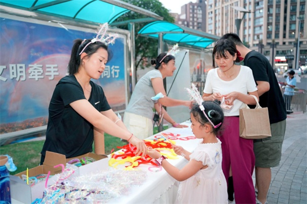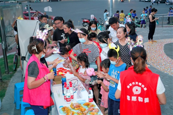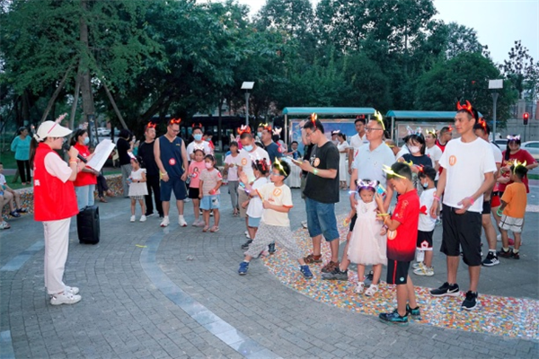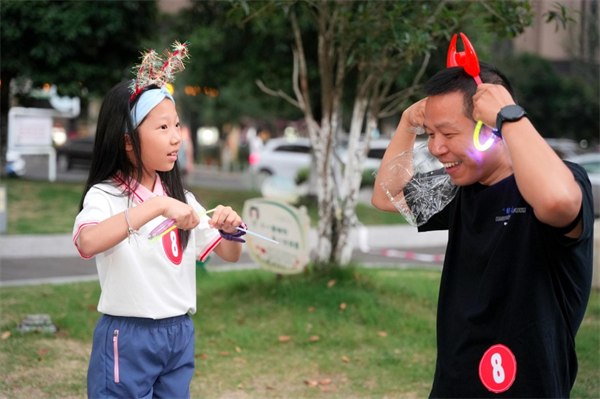 活动分为两个点位同步进行,分别是和美党群服务中心旁广场和紫提东郡3号门旁公园。活动伊始,爸爸们带着小朋友们签到,领取荧光牛角头箍,荧光手环,荧光棒。能和爸爸一起参与活动,小朋友们也都兴奋的戴好后马上亮灯。顿时,现场莹莹闪烁的光束汇聚成绚烂的“星河”,交织出夜色下青春活力与浪漫温馨并存的独特魅力。