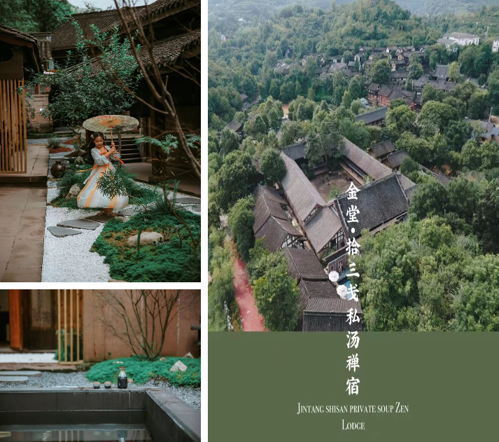 拾三戋私汤禅宿依靠南华宫,凤落沱江畔,这里装修古朴雅致,既有现代感同时也很好的融入了巴蜀特有的娴静和婀娜气质,充满着淳朴而安静的气息。十余间设计精美的房间,配置日式汤池,“一见、一仙、一笕”彰显私汤禅宿的体验精华。2021年营业以来,获得携程旅行网最受欢迎网红民宿奖、携程旅行网最佳度假酒店奖、携程口碑榜成都10大泡汤酒店等荣誉。