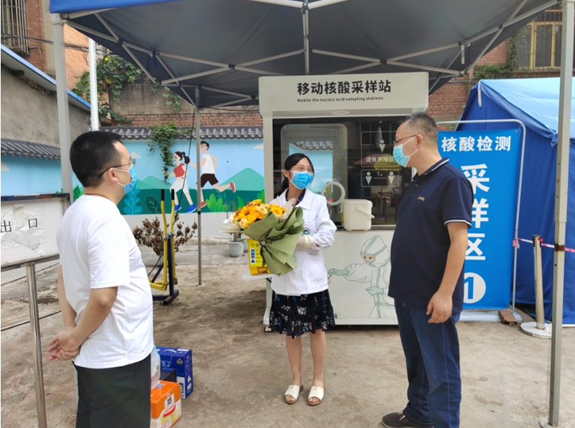 医院党委首先慰问了高温酷暑下坚守在便民核酸采样点以及医学隔离点的医务人员,向他们送上鲜花和慰问品并致以节日的问候。