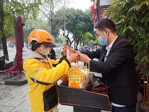 一名骑手正在老字号餐饮企业取餐,准备配送