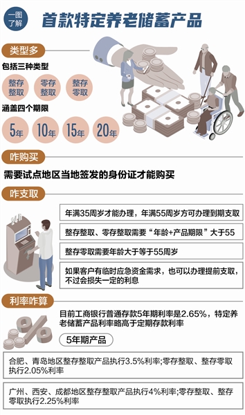 记者从中国工商银行了解到,从11月20日起工商银行在广州、青岛、合肥、西安、成都5个城市营业网点开始发行特定养老储蓄产品,这是我国推出的第一款特定养老储蓄产品。