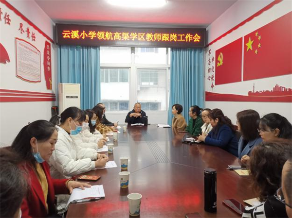11月23日,高渠学区高渠、堠溪、两岔河、聚兴小学语文、数学、英语学科7位教师来到云溪小学参加跟岗活动。云溪小学高度重视跟岗工作,教导处提前安排部署,安排学校教研组长、骨干教师作为辅导教师,制定详细的活动安排。上午8:30,云溪小学辅导教师、高渠学区跟岗教师在学校会议室召开了工作会议,赵超书记做了工作强调。随后,跟岗教师跟随指导教师进入课堂听课,辅导教师对课前的教学准备、备课、作业设计布置进行详细的分享与交流。课后,辅导教师对跟岗教师进行了班主任工作经验分享,分享了班级日常管理、以及针对个别特殊同学个案处理。同时,观摩了大课间活动。下午,老师们参加了云溪小学数学组新进教师汇报课展示的教研活动,与老师们深入交流分享,近距离感受云溪小学浓厚的教研氛围。