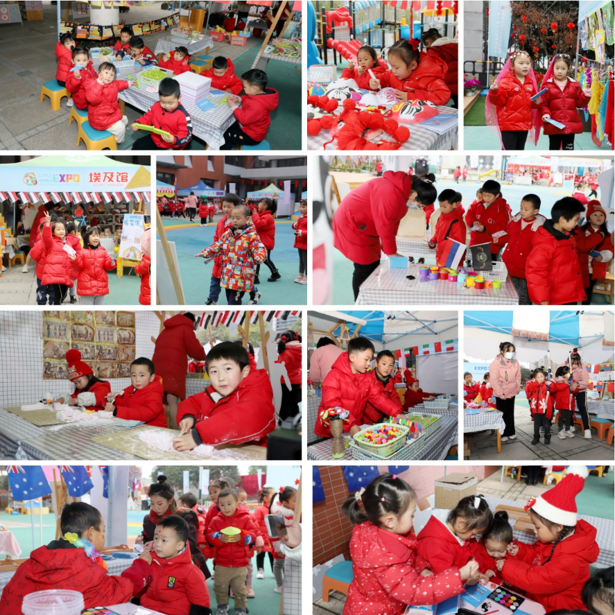 在接下来的“小小世博会”游园活动中,拿着自己的“护照”,带着专有的“西柚币”,去中国馆感受民俗游戏的乐趣,去蒙古国馆体验射箭的新奇,去印度馆参与盲人摸象的奇妙,去埃及馆领会考古文化的神秘……还有许多许多智趣同在的场馆游戏,西柚宝贝们开始了一场身心愉悦的快乐体验。突然,空气中飘来阵阵香味,原来是热气腾腾的新年大餐准备好了,小朋友们齐齐落座于餐桌前,用心品味今日的美味餐点。