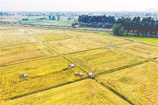 正在进行水稻收割的亲子牧场位于郫都区安靖街道,耕地面积约1600亩。收割机将水稻的根茎整齐地切割,随后水稻的秆儿与穗儿被分离开,金灿灿的稻谷被传输到装粮车之中。